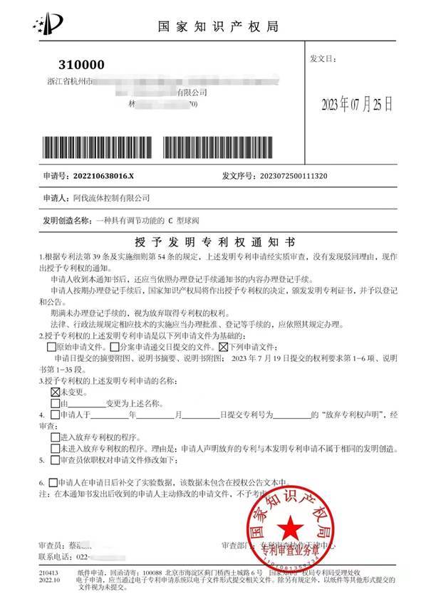 2023年7月25日,阿伐流体控制有限公司(以下简称“AFA公司”)再获两项国家发明专利授权,这是继今年6月份《一种耐磨C型球阀》获得国家发明专利后的又一重大突破。这两项发明专利分别名为《一种球阀生产自动化喷漆设备》和《一种具有调节功能的C型球阀》。至此,AFA公司获得国家发明专利授权数已达到4项。