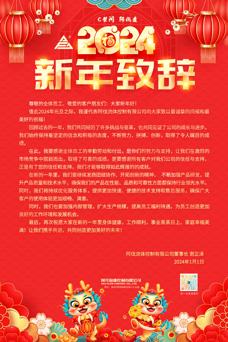 值此2024年元旦之际,我谨代表阿伐流体控制有限公司向大家致以最诚挚的问候和最美好的祝福!